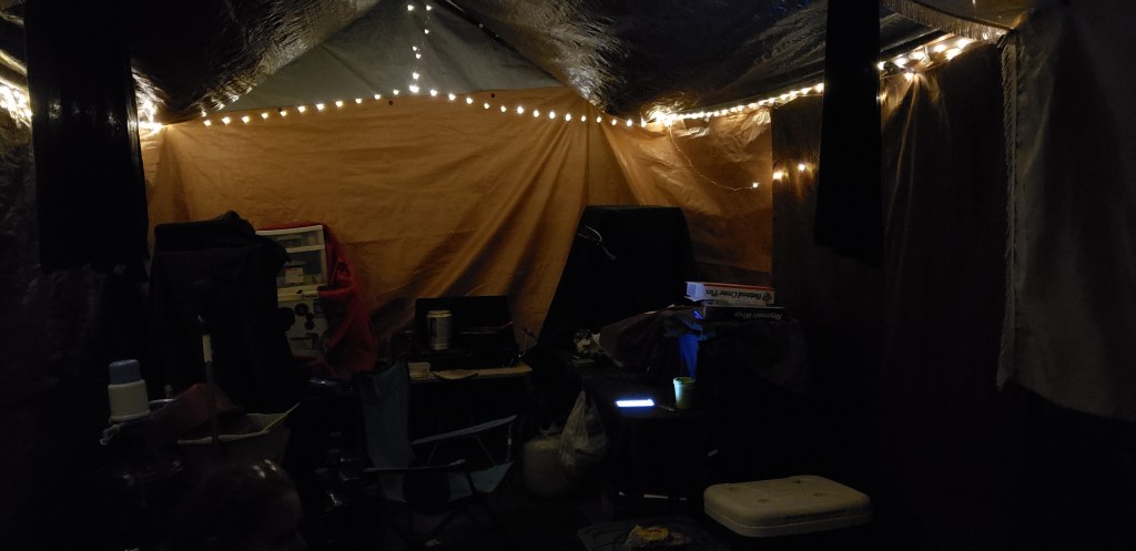 Tomorrow Saturday the talk of getting 45 to 60 Mph wind gusts along with thunderstorms and snow in higher elevations. To get ready (we hope) we tied down the 10×20 even more, enclosed it more then we had and try to block as much wind as possible from hitting it.