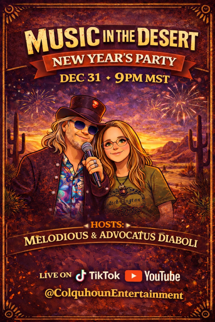 Celebrate the arrival of the New Year with **Music in the Desert**, a live **18+ livestream** hosted by **Advocatus Diaboli** and **Melodious**, streaming from the desert on **Colquhoun Entertainment**.